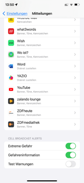 von Apps ist für das Empfangen der Cell Broadcast-Dienste nicht notwendig. Jedes empfangsbereite Gerät in einer betroffenen Mobilfunkzelle wird automatisch informiert.